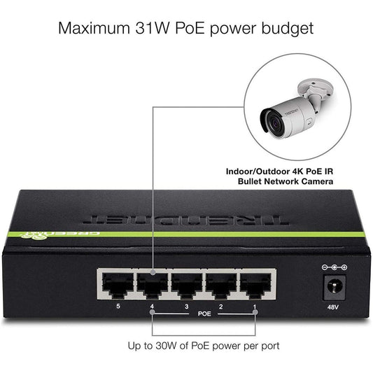 TRENDnet 5-Port Gigabit PoE+ Switch 31 W PoE Budget 10 Gbps Switching Capacity Data & Power Through Ethernet To PoE Access Points And IP Cameras Full & Half Duplex Black TPE-TG50g