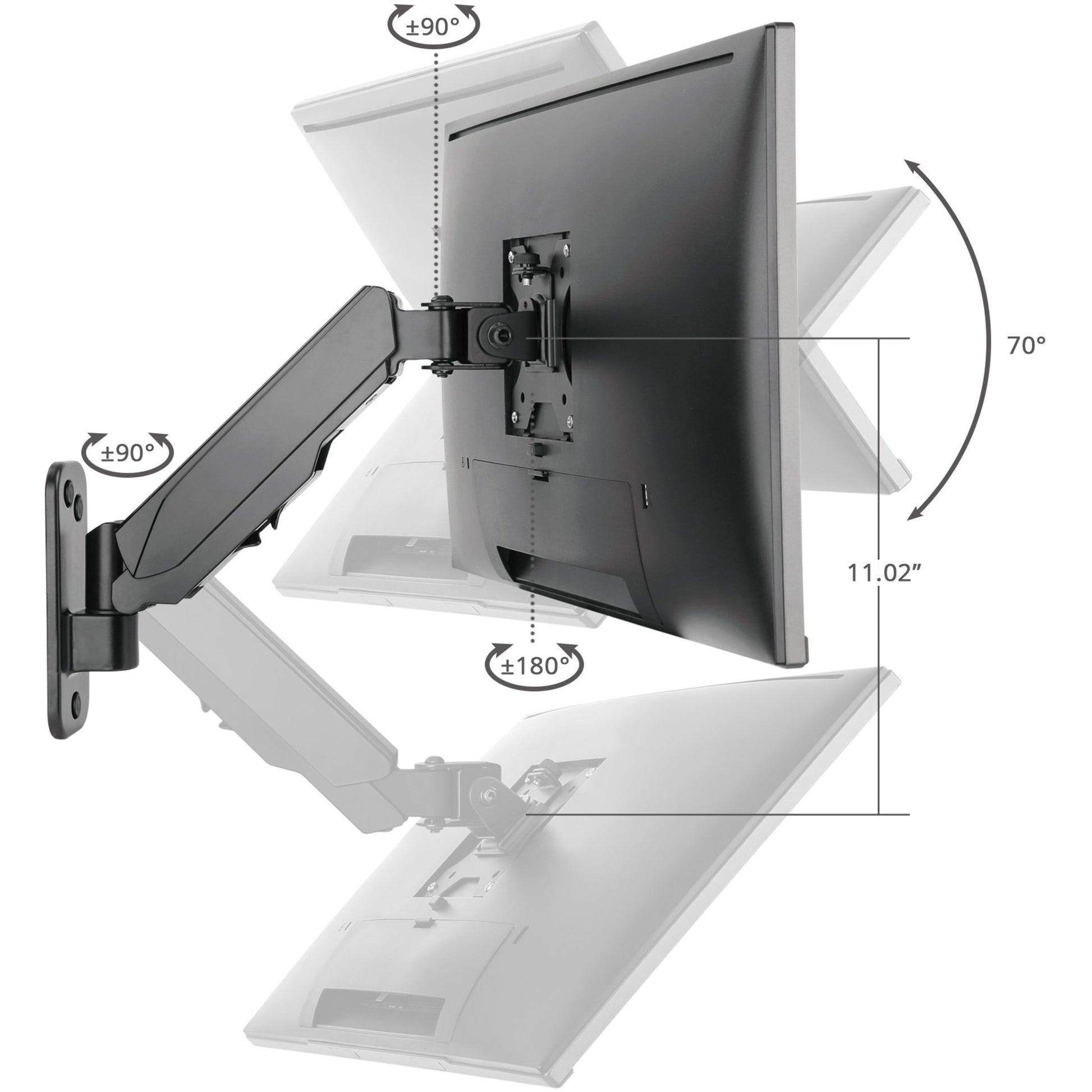 - Premium quality durable gas spring assisted full-motion monitor wall mount provides smooth precise and effortless viewing height adjustment up to 11.02 inches