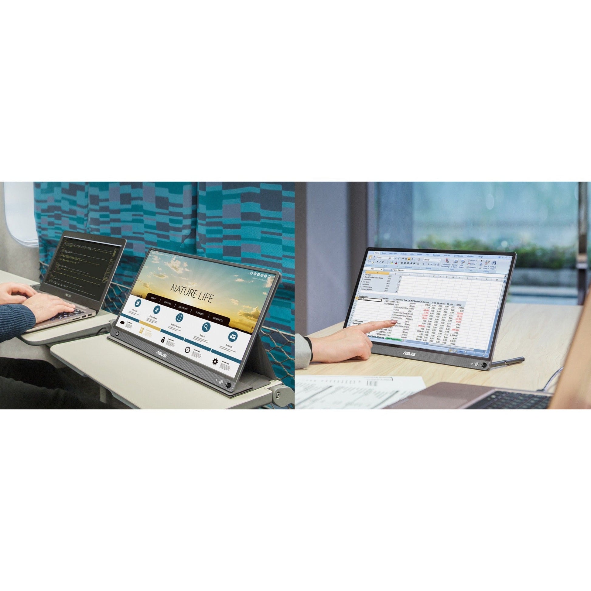 With ASUS DisplayWidget software ZenScreen™ Go MB16AHP can automatically sense its orientation and switch the display between landscape and portrait modes. Landscape mode is ideal for presentations and Excel sheets while Portrait mode gives you a perfect view of items such as documents books or mobile websites.