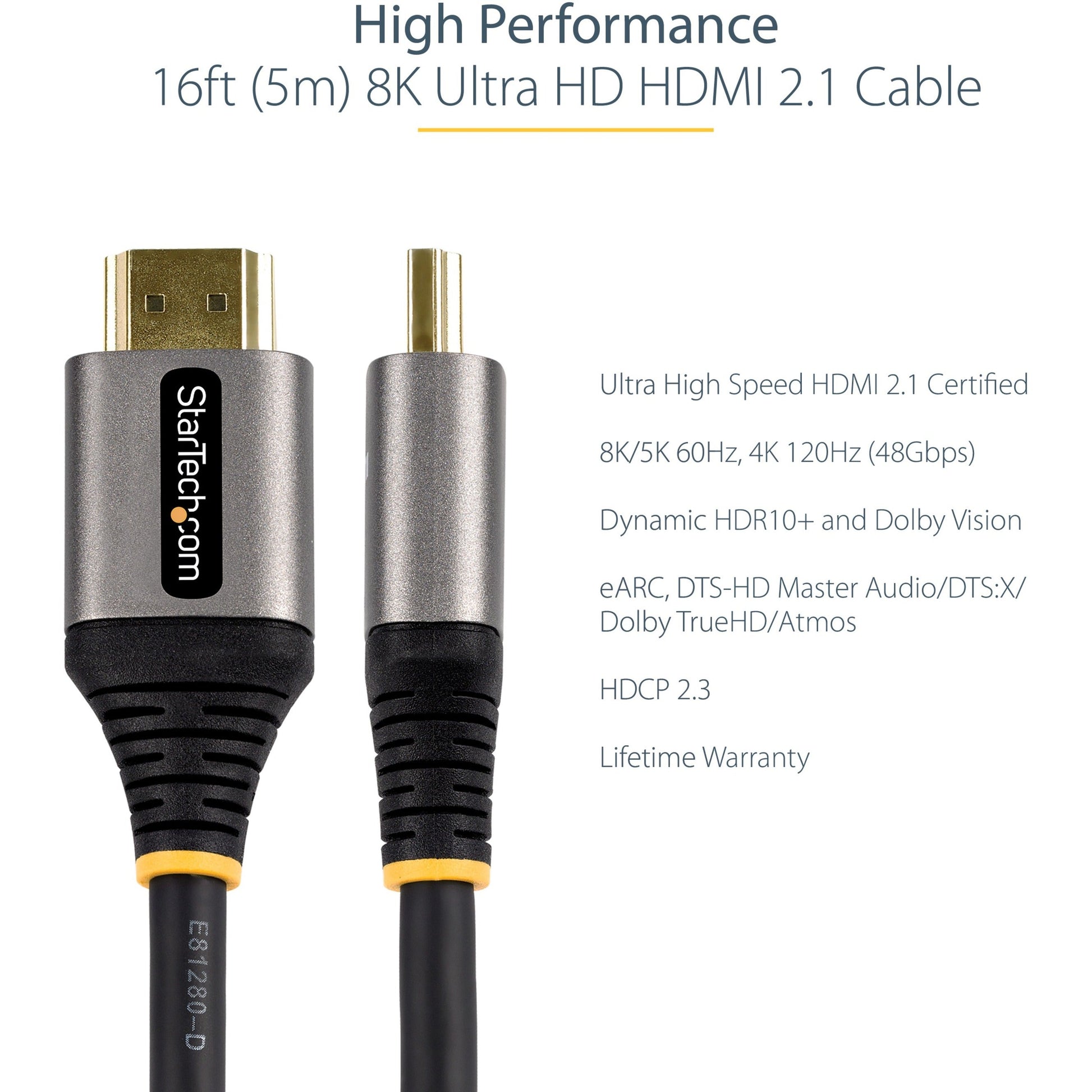 StarTech.com 16ft/5m HDMI 2.1 Cable Certified Ultra High Speed HDMI Cable 48Gbps 8K 60Hz/4K 120Hz HDR10+ 8K HDMI Cable Monitor/Display - 16.4ft/5m Ultra HD HDMI 2.1 cable 8K 60Hz 4K 120Hz; HDR10+/Dolby Vision; eARC DTS:X/Dolby TrueHD/Atmos - Certified Ultra High Speed HDMI cable 48Gbps - 10000+ insertions/100+ bends; HDMI cord w/durable TPE jacket - Laptop/computer; TV/monitor/display